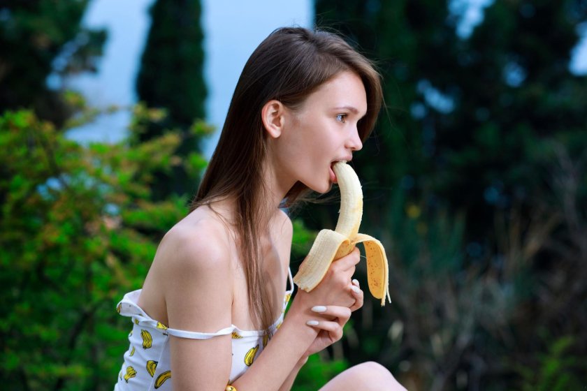 Girl put a banana to herself