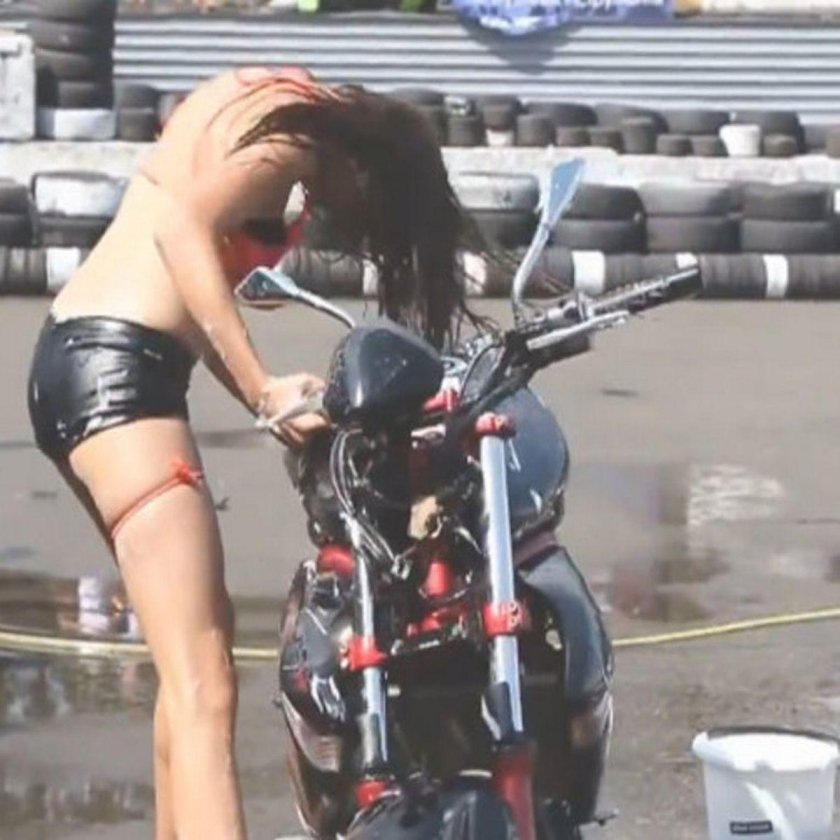The girl washes a motorcycle