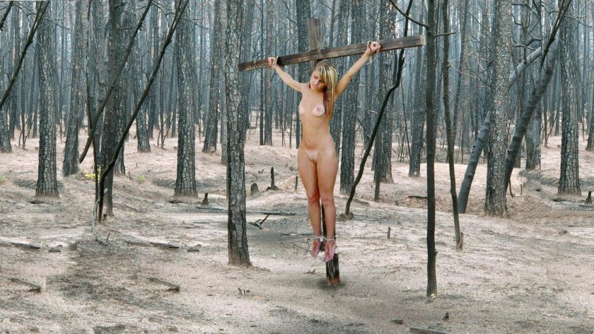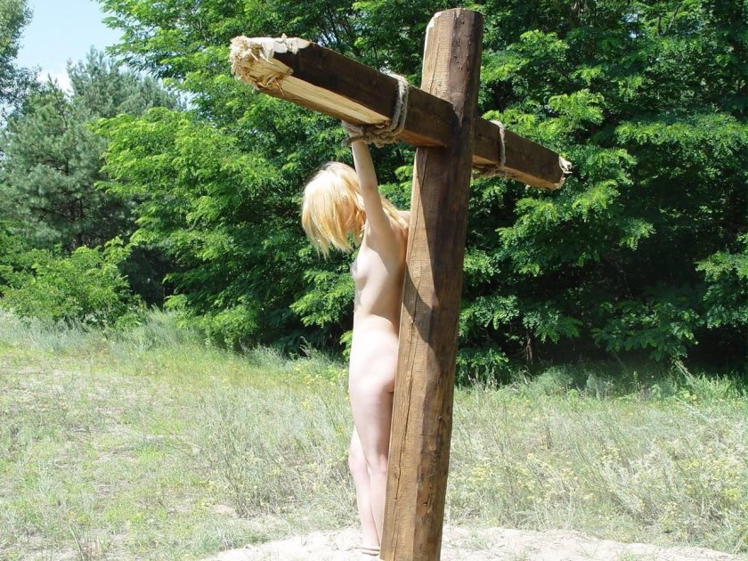 Outdoor bondage girl crucified nude on the wood