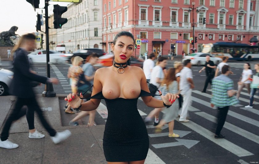 Naked with huge tits walks down the street