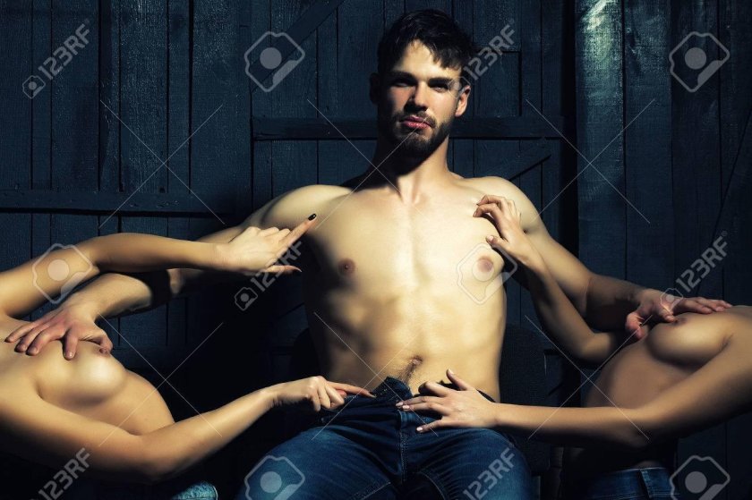Girls in linen with a man of bed