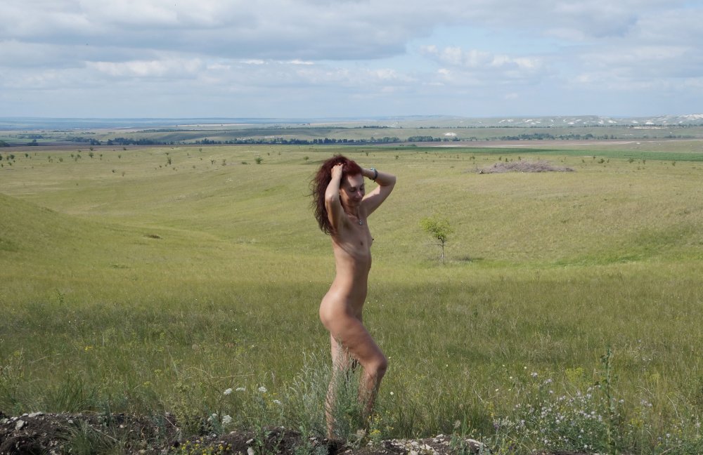 Photo: Beautiful naked brunette in the field